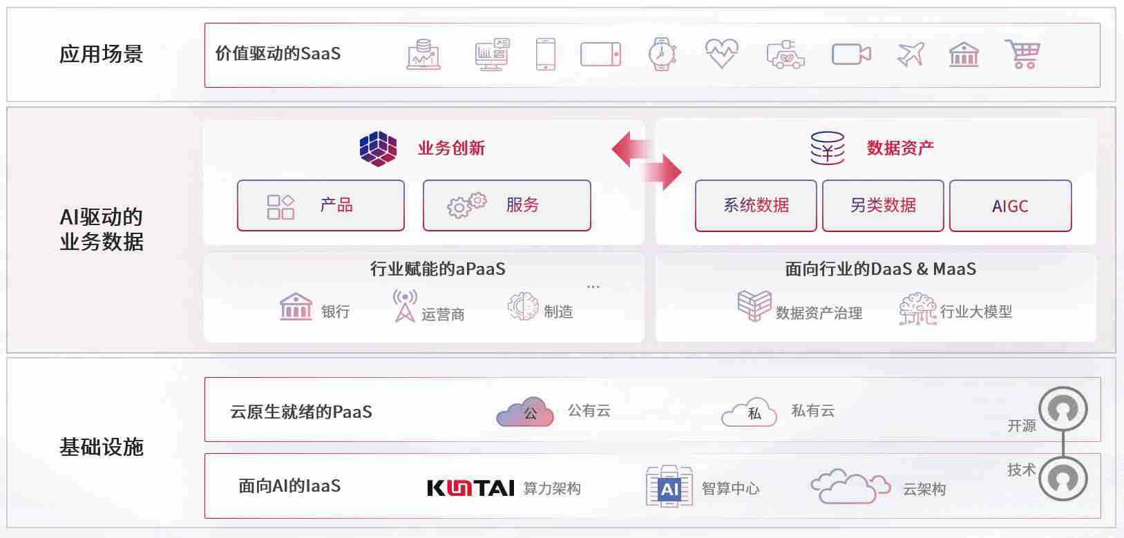 数字时代,,,围绕企业数字化转型的关键要素,,,TOP1体育数码开创性的提出数云融合战略和技术体系框架,,,着力在云原生、、、数字原生、、、AI原生和信创产业上架构产品和服务能力,,,为处在不同数字化转型阶段的快消零售、、、、汽车、、金融、、医疗、、政企、、、、教育、、运营商等行业客户提供泛在的敏捷IT能力和融合的数据驱动能力,,,构建跨界融合创新的数字业务场景和新业务模式,,,,助力企业级客户建立面向未来的核心能力和竞争优势,,全面推动社会的数字化、、、智能化转型升级。。。